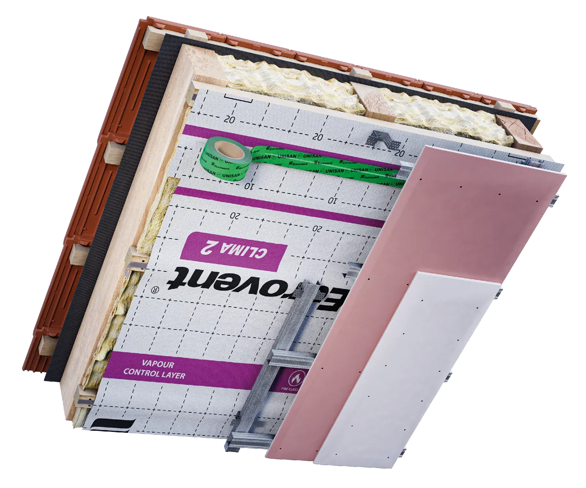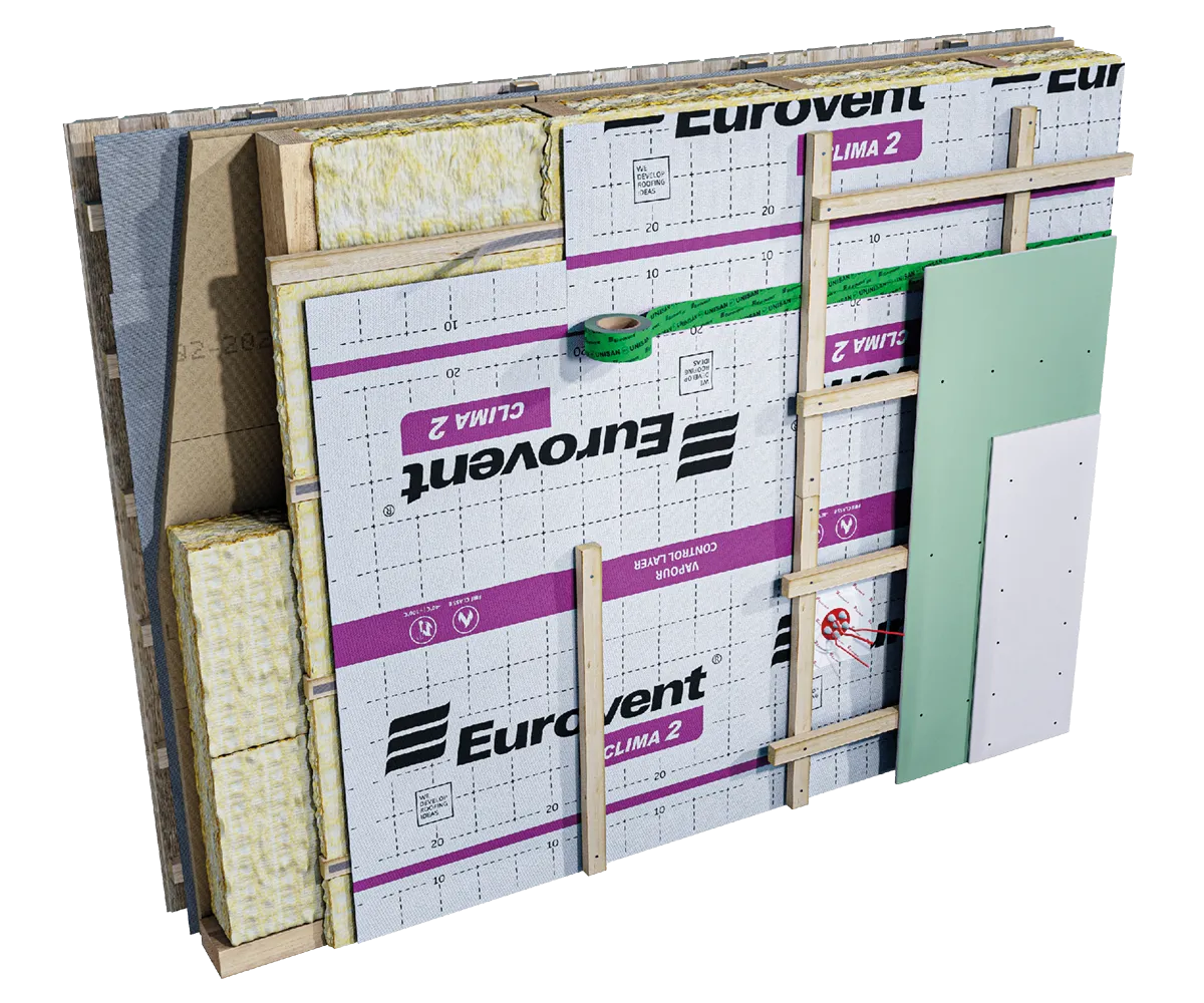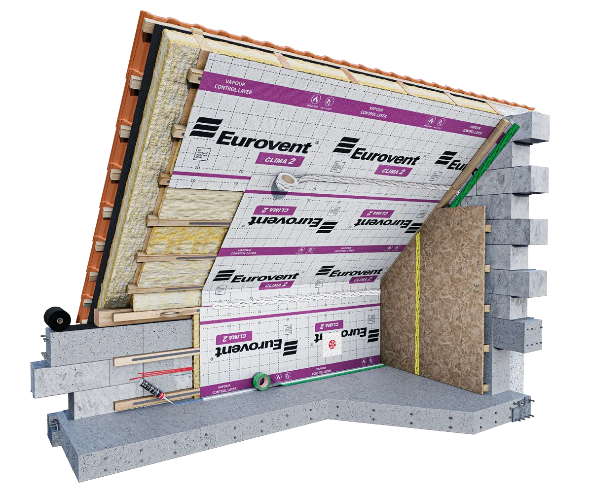 Membrana paroizolacyjna Eurovent® CLIMA 2 znajduje zastosowanie jako warstwa paroizolacyjna chroniąca poddasze i ścianę przed przedostawaniem się nadmiaru wilgoci z wnętrza pomieszczenia do izolacji termicznej. Jej aktywne właściwości skutecznie zapobiegają efektowi „torby foliowej”, eliminując ryzyko powstawania grzybów i pleśni. Eurovent® CLIMA 2 jest polecana zarówno w budownictwie mieszkaniowym, jak i przemysłowym, znajdując zastosowanie w wielu technologiach konstrukcyjnych, takich jak budownictwo prefabrykowane, modułowe, szkieletowe oraz tradycyjne. Podczas montażu membrany paroizolacyjnej Eurovent® CLIMA 2 zalecne jest korzystanie z taśm klejących Eurovent® UNISAN oraz Eurovent® DUO do sklejania kolejnych zakładów membrnay oraz taśmy Eurovent® UNO do uszczelniania miejsc łączenia z elementami konstrukcyjnymi.