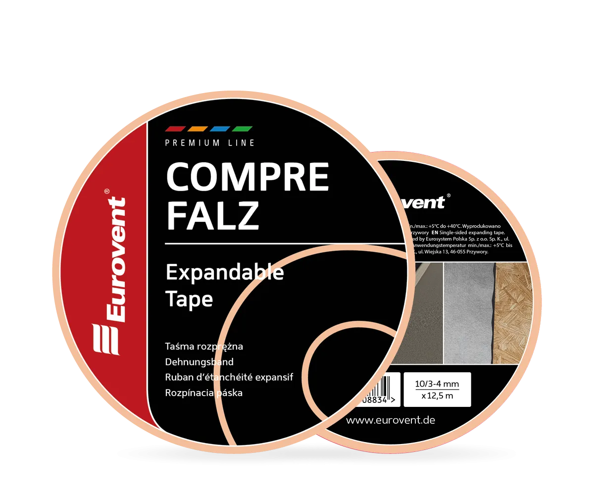 Taśma rozprężna Eurovent® COMPRE FALZ wykonana elastycznej pianki poliuretanowej nasączonej zmodyfikowanym akrylem. Wstępnie skompresowana taśma po zamontowaniu rozprężą się, zwiększając wielokrotnie swoją objętość. Posiada klasę trudno palności B1 oraz klasę uszczelnienia (odporność na zacinający deszcz) do 600 Pa. Eurovent® COMPRE FALZ jest odporna na czynniki atmosferyczne oraz promieniowanie UV. Do jej podstawowych zastosowań należy zabezpieczenie i uszczelnienie luk, fug i szczelin przy wykonywaniu zakładów z blach płaskich łączonych na rąbek stojący, sprawdza się również do uszczelnień połączeń w panelach dachowych na rąbek stojący tzw. „CLICK”.