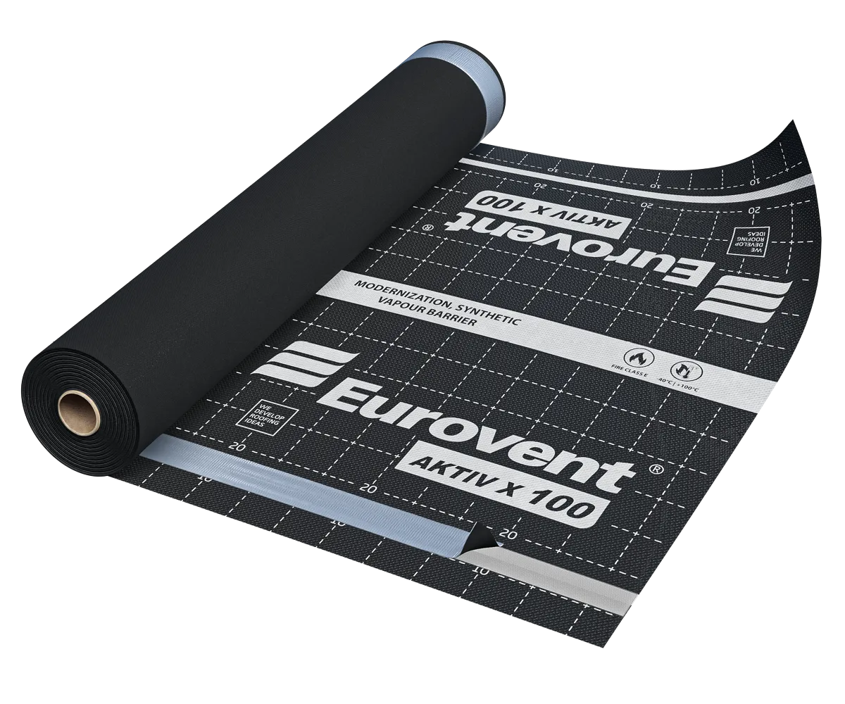 Eurovent® AKTIV X 100 is a four-layer synthetic vapour barrier membrane with an Sd value of approx. 100 m. Designed specifically for renovation projects, particularly in inverted roof systems. It forms an effective barrier against water vapour penetration from the inside of the building towards the attic, providing excellent protection of thermal insulation against condensation. Its four-layer synthetic structure ensures extreme tear resistance and enhanced UV resistance, ensuring reliable and secure installation as well as airtightness even under demanding conditions.