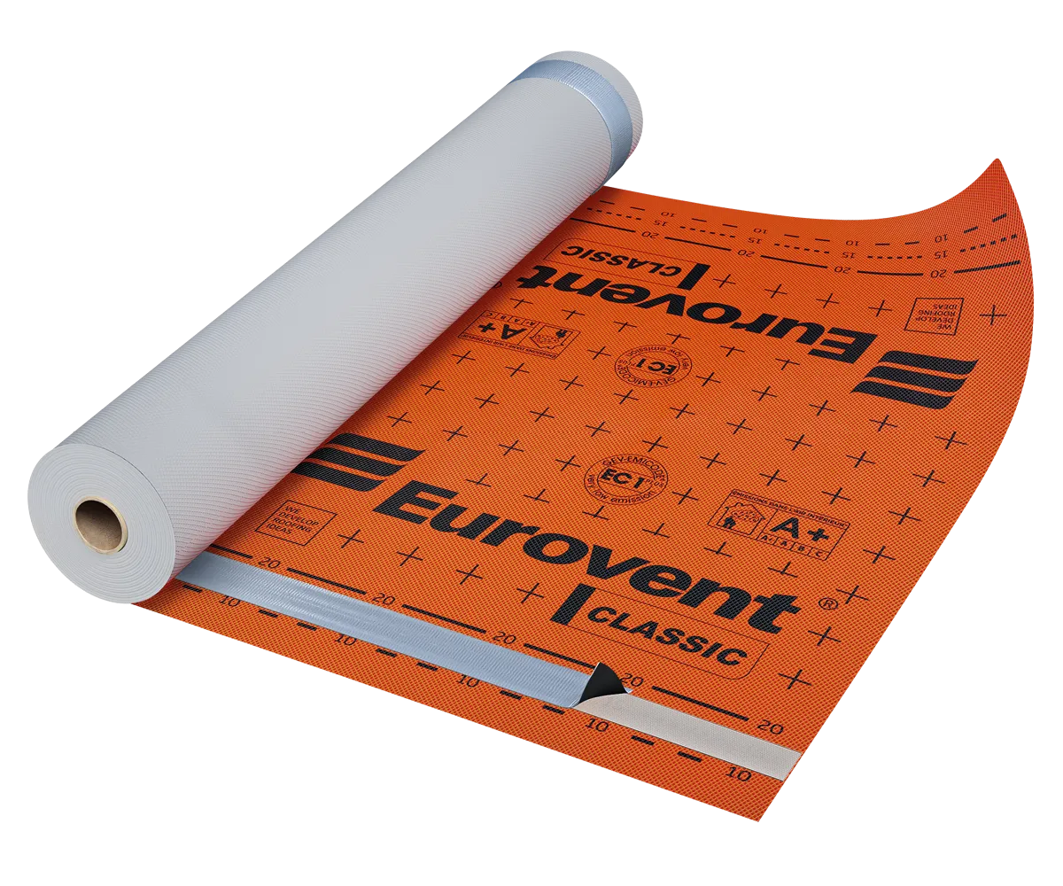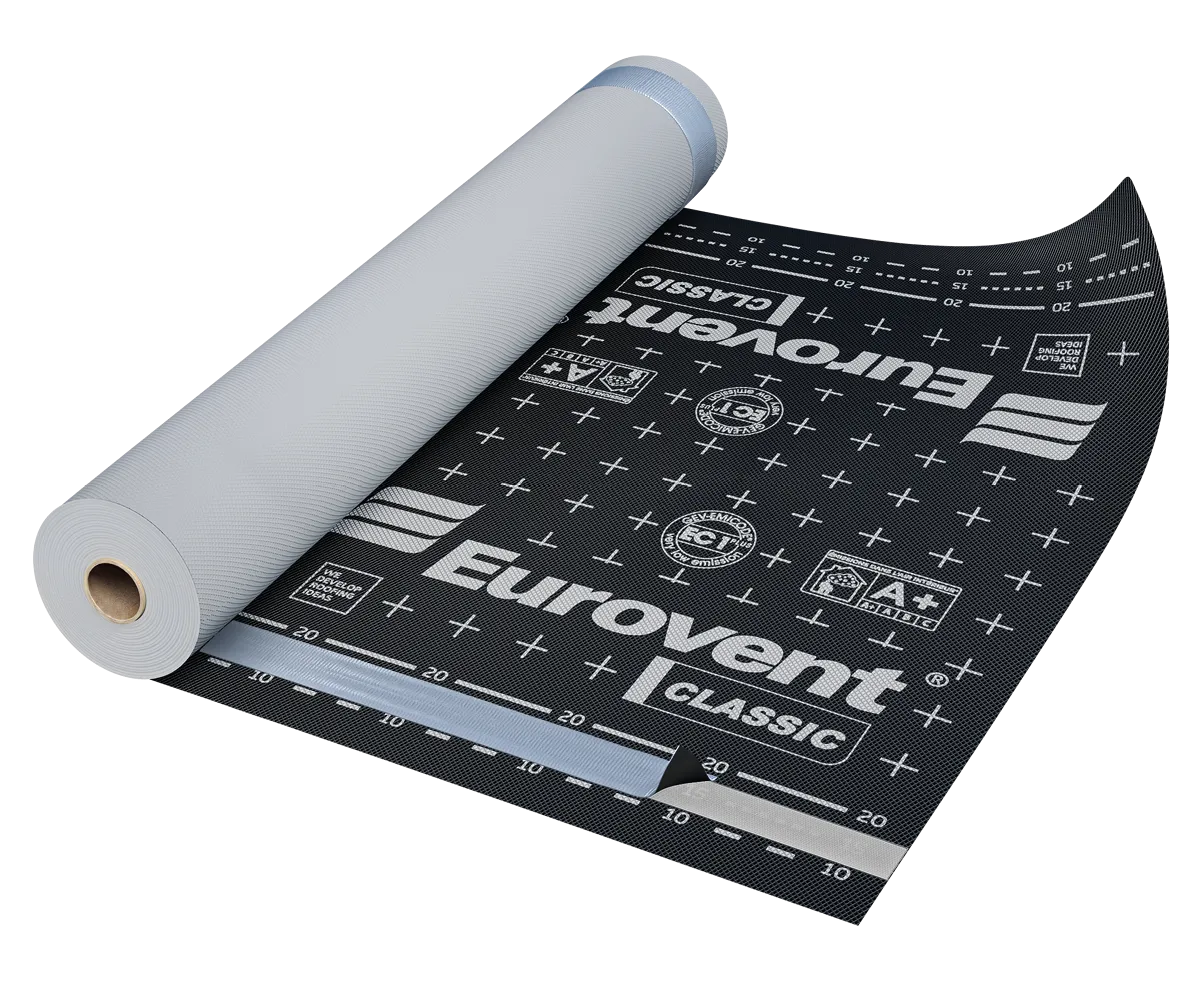 The Eurovent® CLASSIC roof membrane is used as an underlay for pitched, insulated and ventilated roofs, including roofs with full boarding. It performs particularly well in roof and attic renovation using the “inverted roof” system. The product does not require a ventilation gap between the membrane and the thermal insulation (mineral wool, glass wool, etc.), which means the membrane can be in direct contact with the insulation. Installation of the final roof covering on the membrane must always be carried out using battens and counter-battens. It is suitable for use under almost all types of roof coverings, in particular ceramic tiles, concrete tiles and metal roofing tiles.