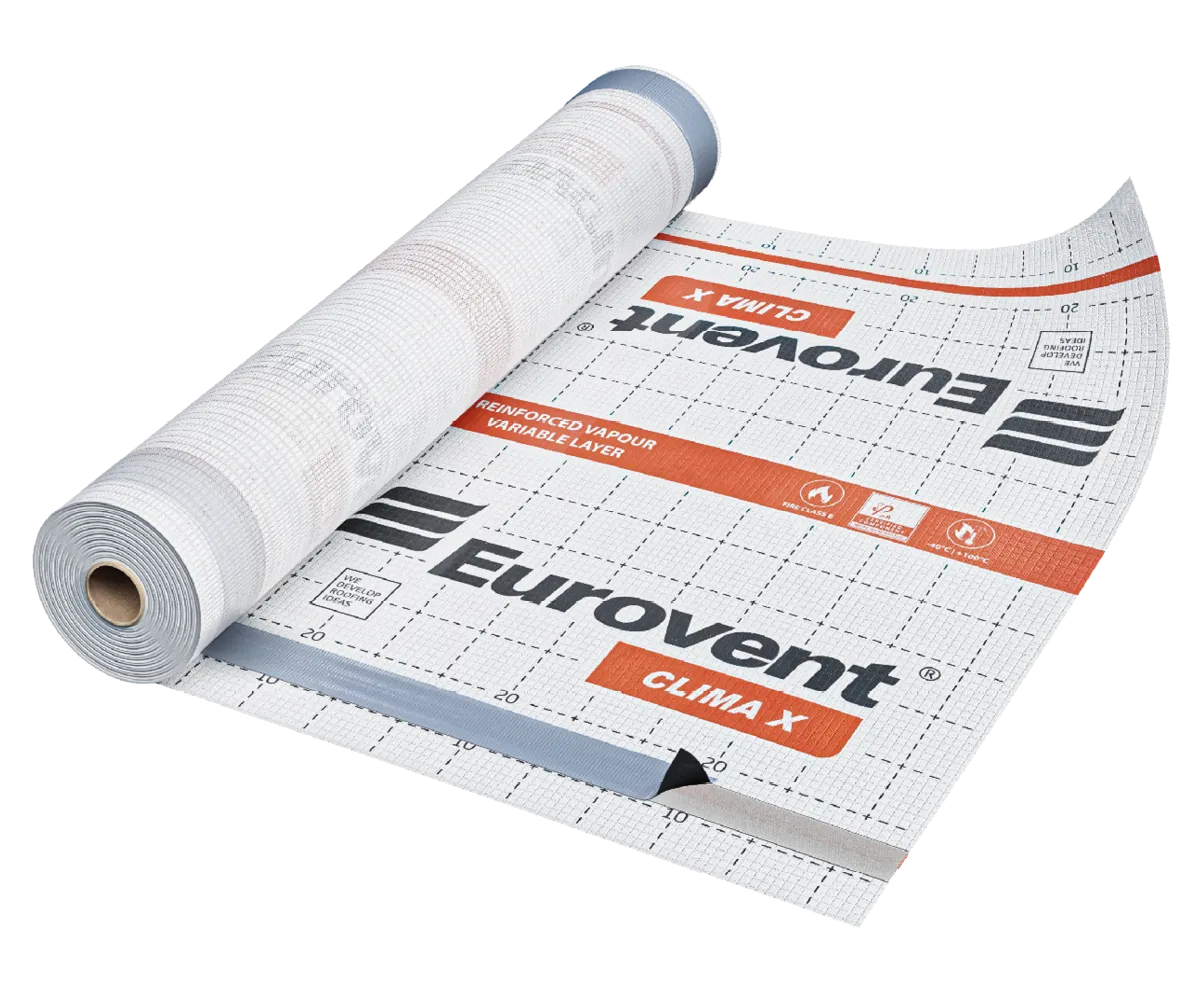 The Eurovent® CLIMA X vapour control membrane is used in residential and industrial construction, as well as in timber-frame buildings, as a vapour barrier layer protecting attics against the penetration of excess moisture from the interior into the thermal insulation. It is applied in roof and wall constructions. Thanks to its active properties, it prevents, among other things, the “plastic bag effect”, i.e. the formation of mould and fungi in the attic as a result of excess moisture. During installation, the use of Eurovent® DUO adhesive tape is mandatory for bonding overlapping joints, and Eurovent® UNO tape for sealing connections with roof structural elements.