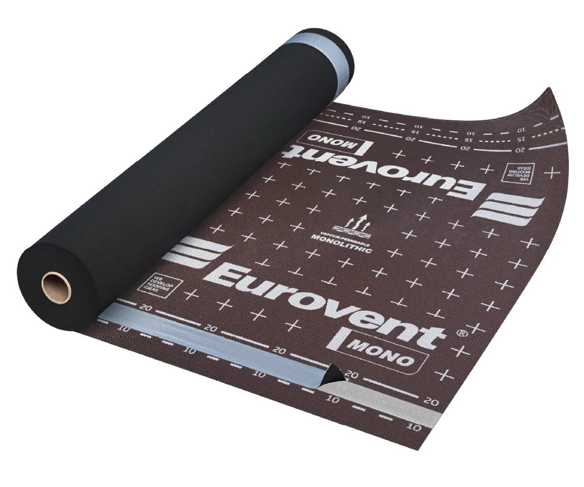 The Eurovent® MONO roof membrane is used as an underlay for pitched, insulated and ventilated roofs, including roofs with full boarding. The product does not require a ventilation gap between the membrane and the thermal insulation (mineral wool, glass wool, etc.), which means the membrane may be in direct contact with the insulation. Installation of the final roof covering on the membrane must always be carried out using battens and counter-battens. It is suitable for use under almost all types of roof coverings, in particular ceramic tiles, concrete tiles, metal roofing tiles and aluminium sheets.