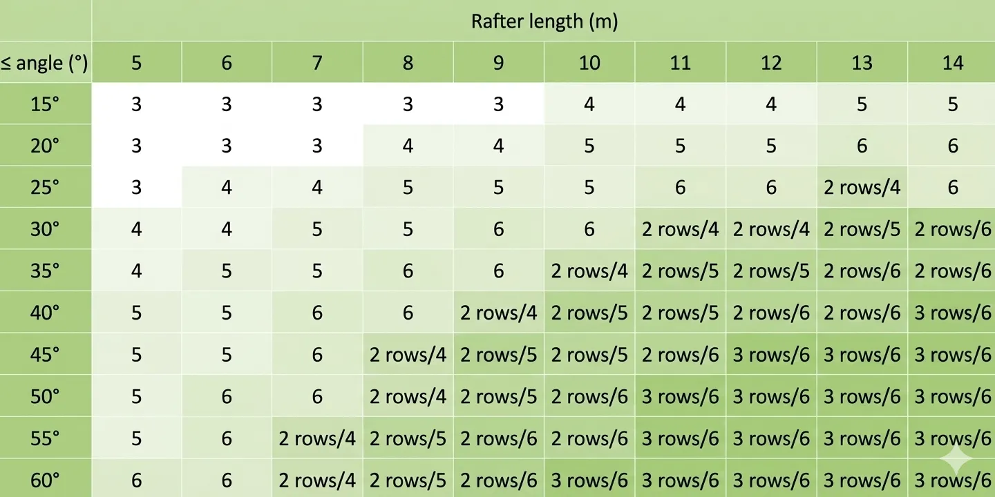 Thanks to the tables and the map, users can easily determine the required number of brackets and the appropriate installation method for their roof. The tables present the recommended number of brackets used for installing snow protection barriers on metal roof tile coverings, depending on the roof pitch angle and the rafter length.
