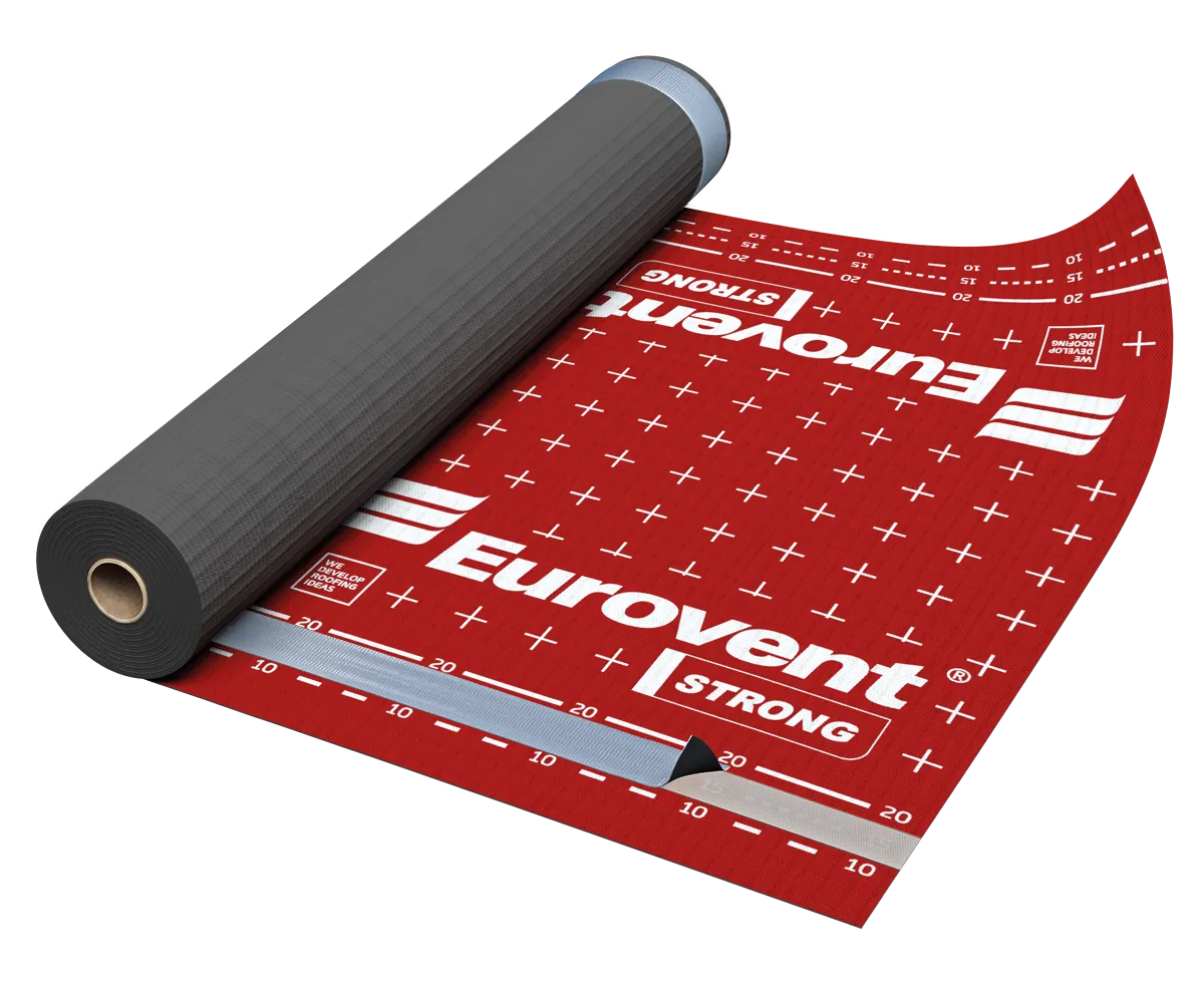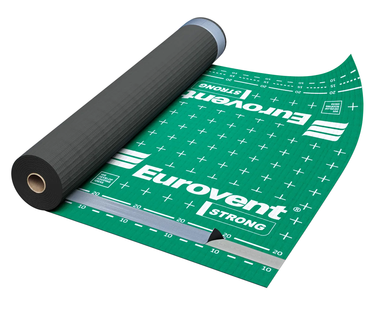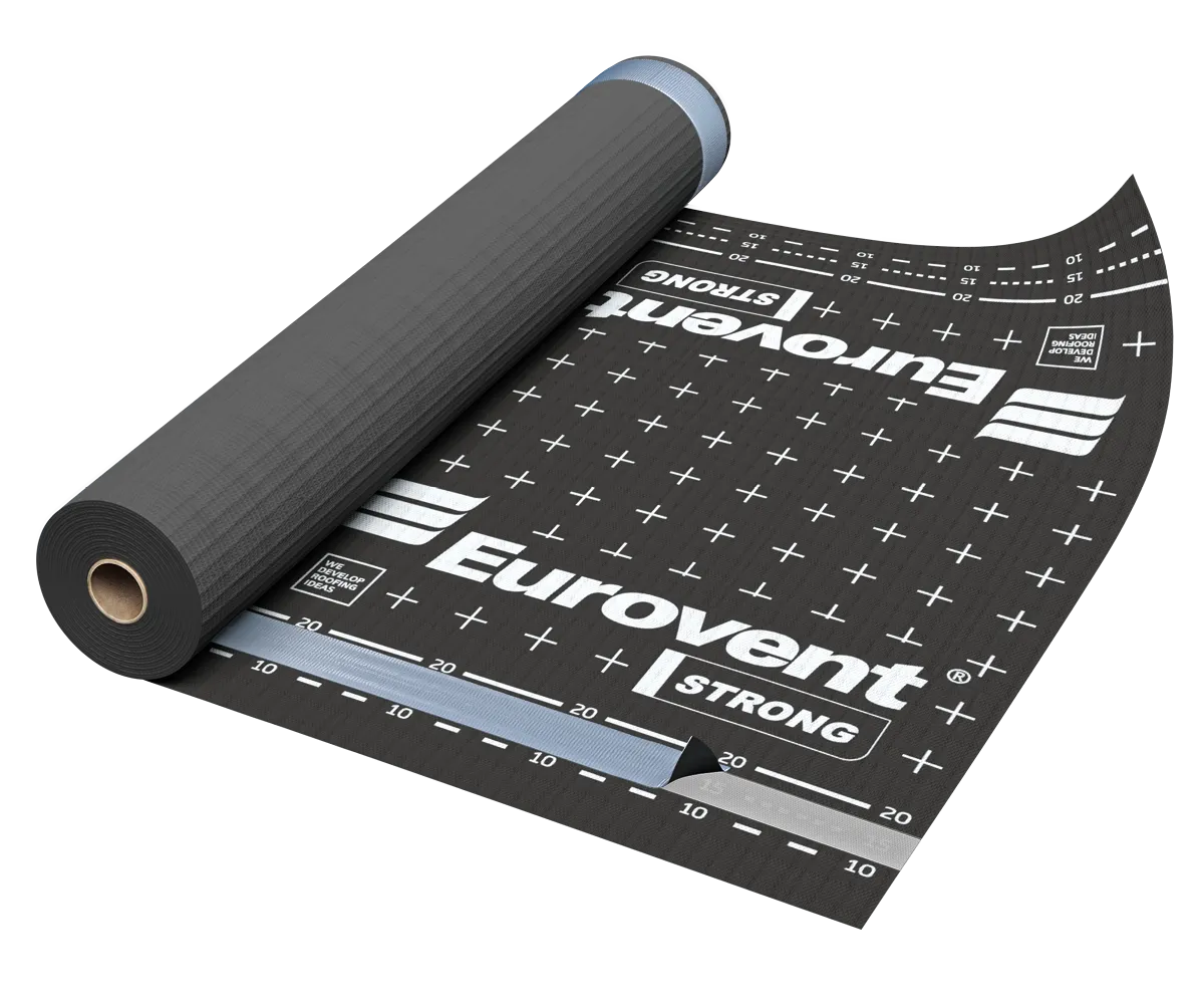 The Eurovent® STRONG roof membrane is used as an underlay for pitched, insulated and ventilated roofs, including roofs with full boarding. The product does not require a ventilation gap between the membrane and the thermal insulation (mineral wool, glass wool, etc.), which means the membrane may be in direct contact with the insulation. Installation of the final roof covering on the membrane must always be carried out using battens and counter-battens. It is suitable for use under almost all types of roof coverings, in particular ceramic tiles, concrete tiles, metal roofing tiles and natural slate.