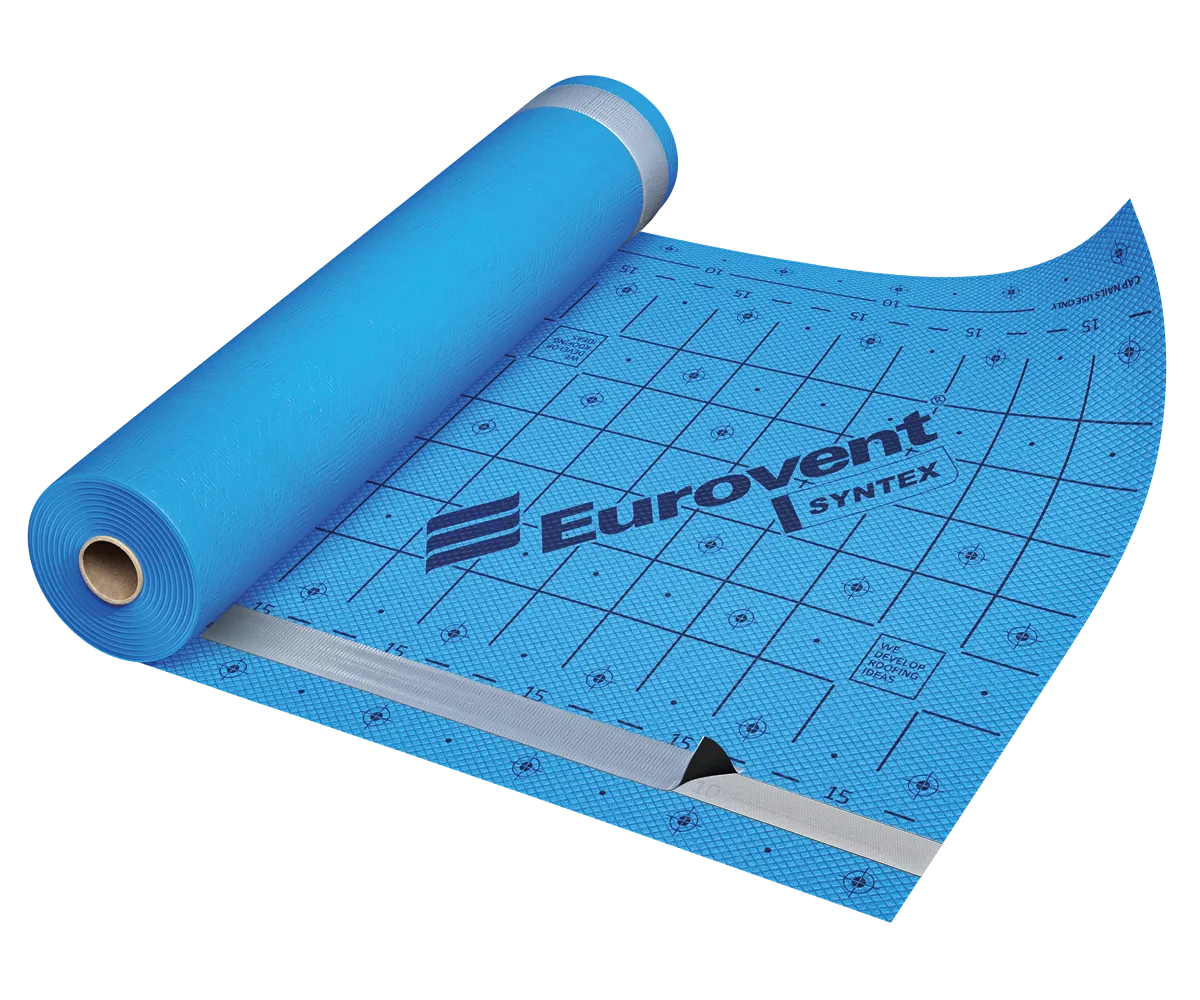 The Eurovent® SYNTEX roof membrane is used as an underlay for most roof coverings on ventilated pitched roofs (with particular suitability for bituminous shingles, wooden shingles, slate, etc.), as well as for boarded and non-boarded roofs, both thermally insulated and non-habitable. A ventilation gap between the membrane and the thermal insulation (mineral wool, glass fibre) must be maintained in accordance with the design requirements. The product must not be installed directly on the thermal insulation. Installation of the final roof covering on the membrane can be carried out without the use of battens and counter-battens.