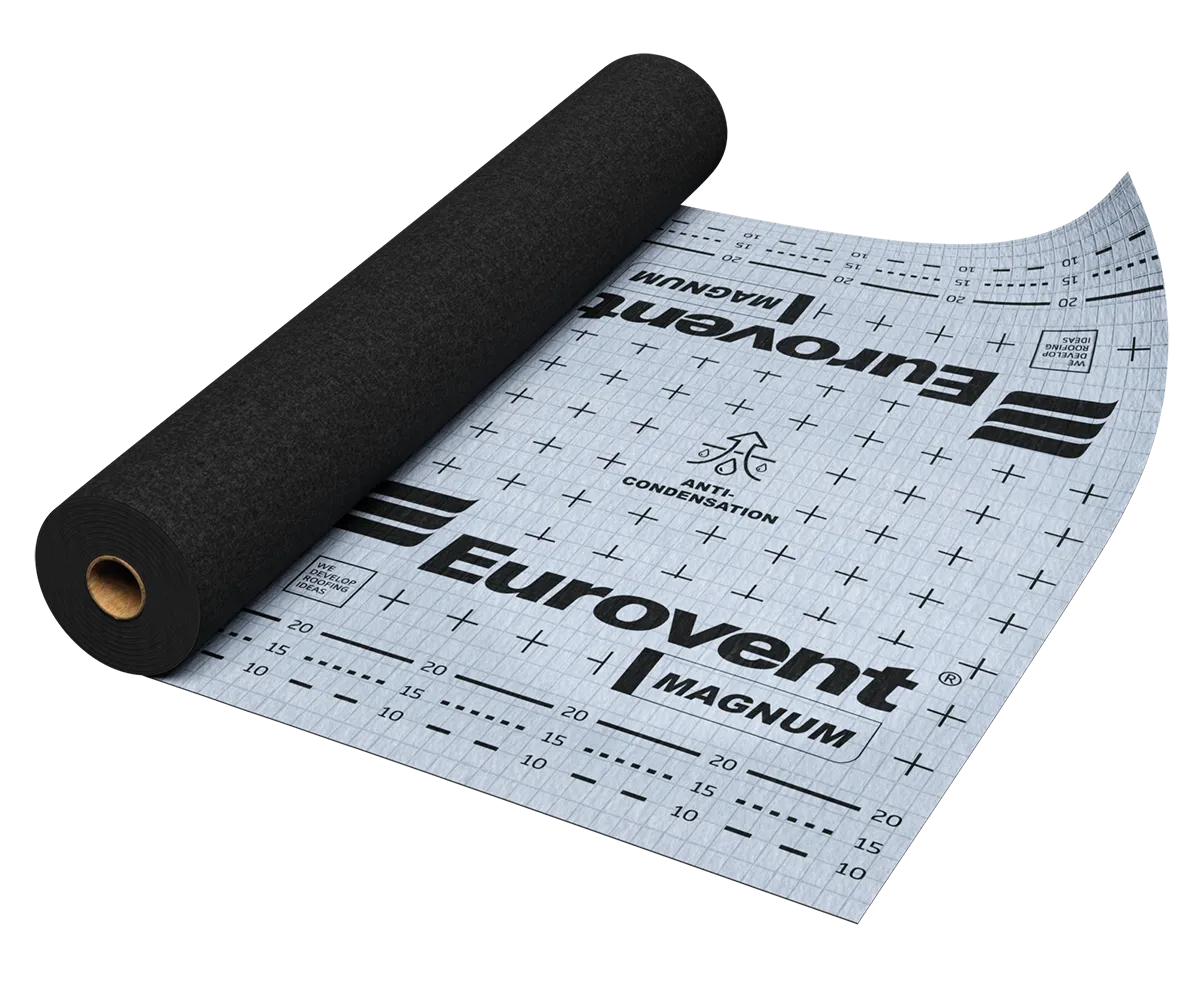 Membrana dachowa Eurovent® MAGNUM, antykondensacyjna, paroprzepuszczalna. Stosowana do dachów skośnych ocieplonych i wentylowanych, także z pełnym deskowaniem i o niskim kącie nachylenia. Nadaje się pod dachówki betonowe, ceramiczne, blachodachówki, blachy aluminiowe, łupek naturalny.