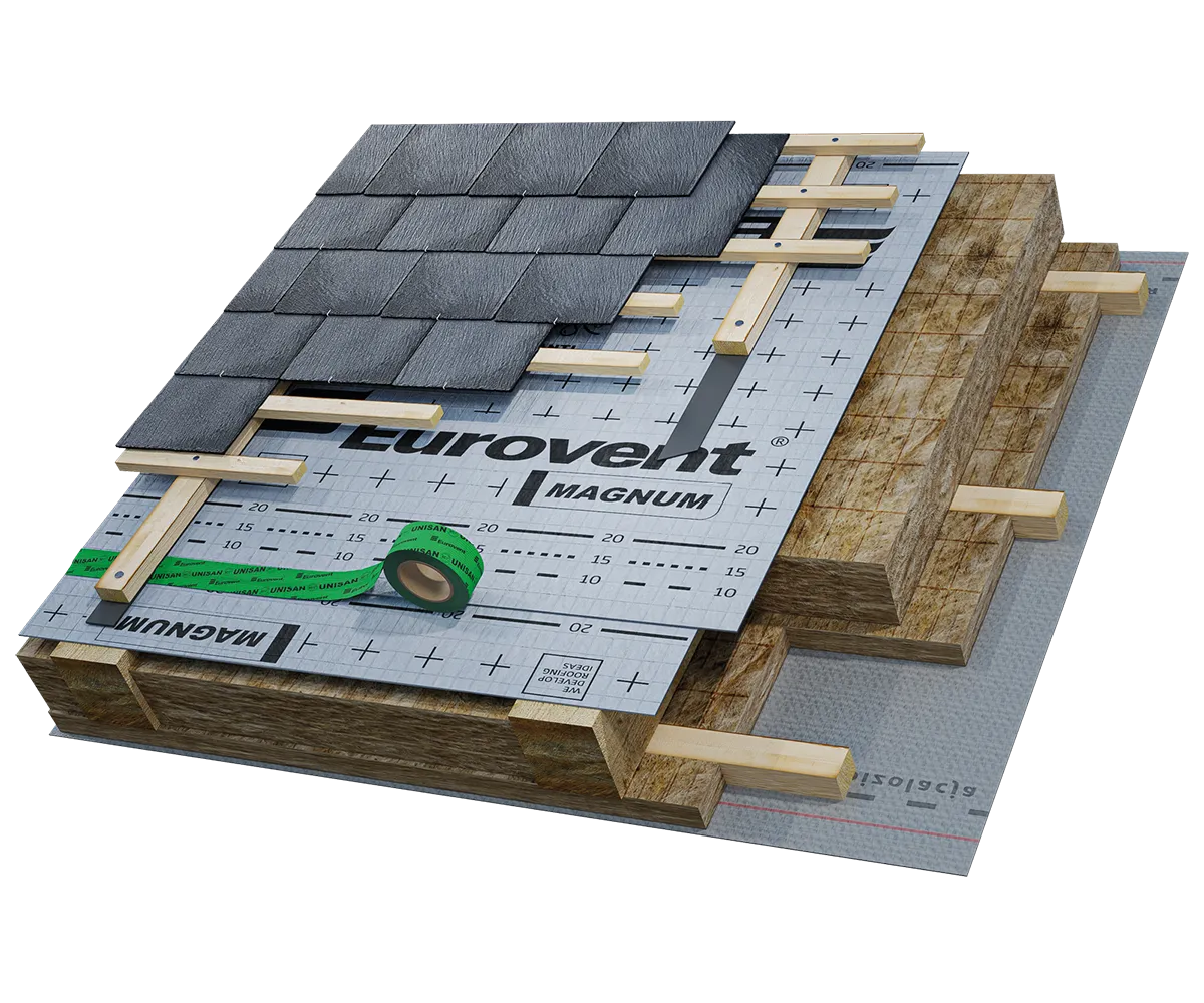 Membrana dachowa Eurovent® MAGNUM znajduje zastosowanie jako wstępne krycie dachów skośnych, ocieplonych, wentylowanych, również z pełnym deskowaniem. Dzięki swojej budowie i wytrzymałości jako jeden z niewielu produktów na rynku jest zalecana również przy kryciu łupkiem. Produkt wymaga zachowania szczeliny wentylacyjnej między membraną a izolacją termiczną (wełna mineralna, szklana itp.), co oznacza, że membrana nie może stykać się bezpośrednio z ociepleniem. Montaż ostatecznego pokrycia dachowego na membranie należy wykonać zawsze z zastosowaniem łaty i kontrłaty. Nadaje się do stosowania prawie pod wszystkie typy pokryć dachowych, a w szczególności pod łupek, dachówki ceramiczne, betonowe, blachodachówki, blachy aluminiowe itp.