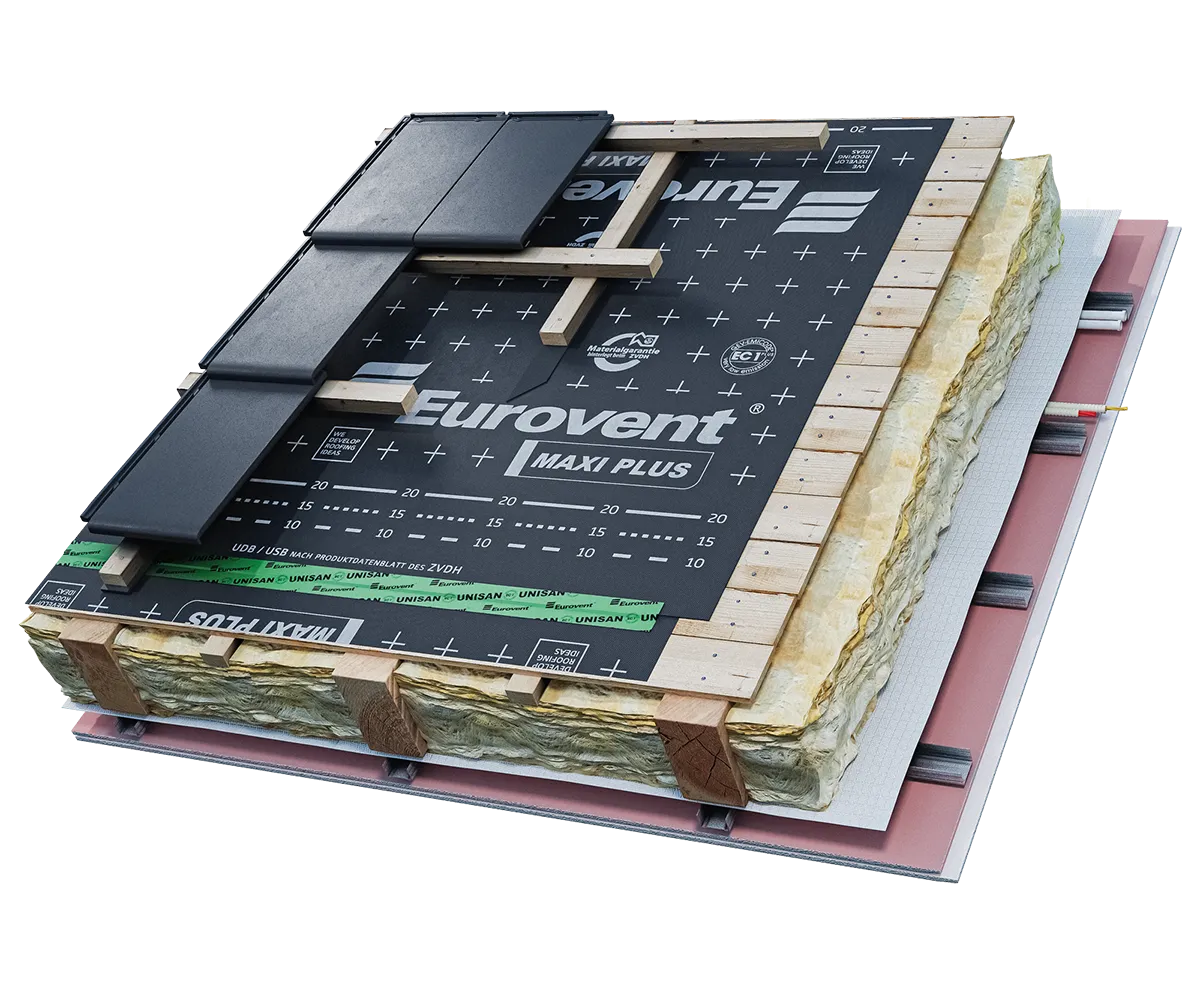 Membrana dachowa Eurovent® MAXI PLUS znajduje zastosowanie jako wstępne krycie dachów skośnych, ocieplonych, wentylowanych, również z pełnym deskowaniem. Produkt nie wymaga zachowania szczeliny wentylacyjnej pomiędzy membraną a izolacją termiczną (wełna mineralna, szklana itp.), co oznacza, że membrana może stykać się bezpośrednio z ociepleniem. Montaż ostatecznego pokrycia dachowego na membranie należy wykonać zawsze z zastosowaniem łaty i kontrłaty. Nadaje się do stosowania prawie pod wszystkie typy pokryć dachowych, a w szczególności pod dachówki ceramiczne, betonowe, blachodachówki, blachy aluminiowe itp.