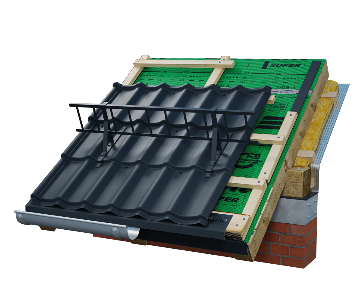 Eurovent® SNOWSTOPPER SET METAL 350 znajduje zastosowanie jako element ochrony przeciwśniegowej zabezpieczający przed osuwaniem się dużych ilości śniegu z połaci dachowej krytej blachodachówką profilowaną. Zestaw może być stosowany na dachach skośnych o nachyleniu od 10° do 90°. Dzięki szerokiej gamie wsporników produkt można dopasować prawie do każdego rodzaju blachodachówek o module 350/25. Zestaw pakowany jest w karton w którym znajdują się wszystkie elementy montażowe co znacznie skraca czas instalacji i eliminuje ewentualne pomyłki przy kompletowaniu zestawu. W przypadku długości 2,0 m oraz 3,0 m poszczególne elementy są łączone ze sobą specjalnymi łącznikami Eurovent® CLIP załączonymi do zestawu.