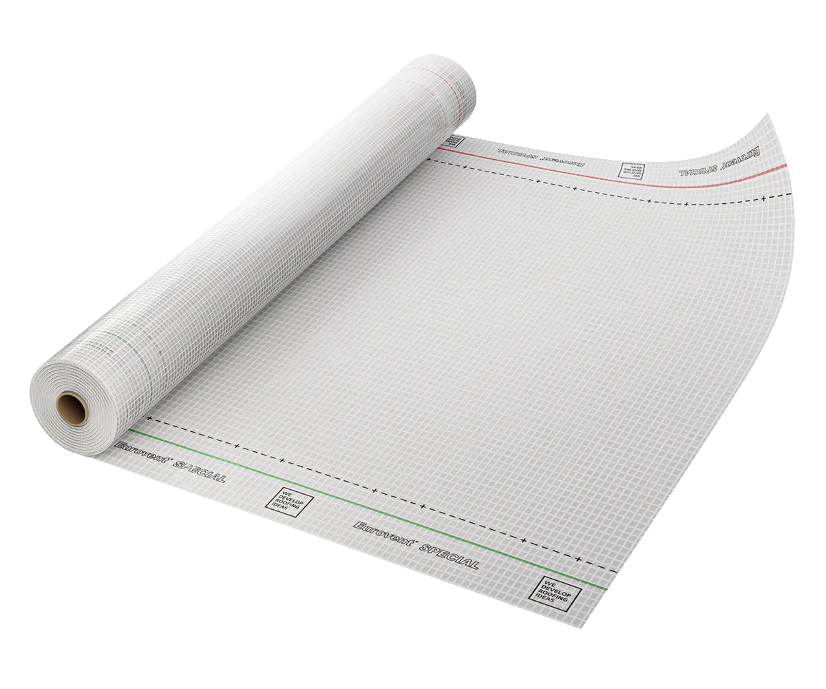 Folia dachowa Eurovent® SPECIAL, mikroperforowana, niskoparoprzepuszczalna. Zbudowana z obustronnie powleczonej siatki PE która zapewnia wysoką wytrzymałość produktu na rozrywanie. Stosowana do dachów niedeskowanych, spadzistych (skośnych), wentylowanych, nieocieplonych.