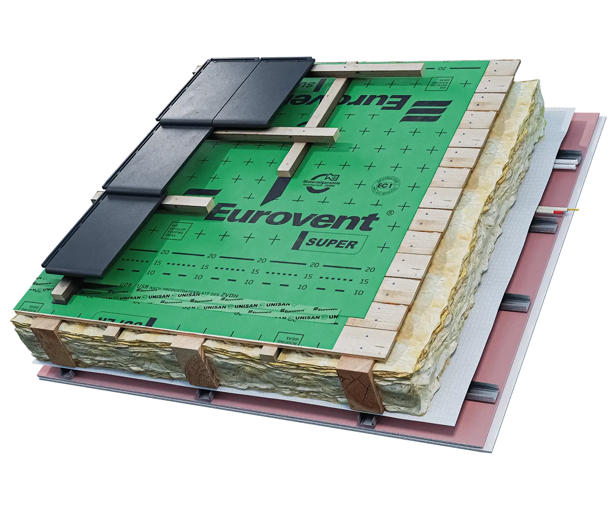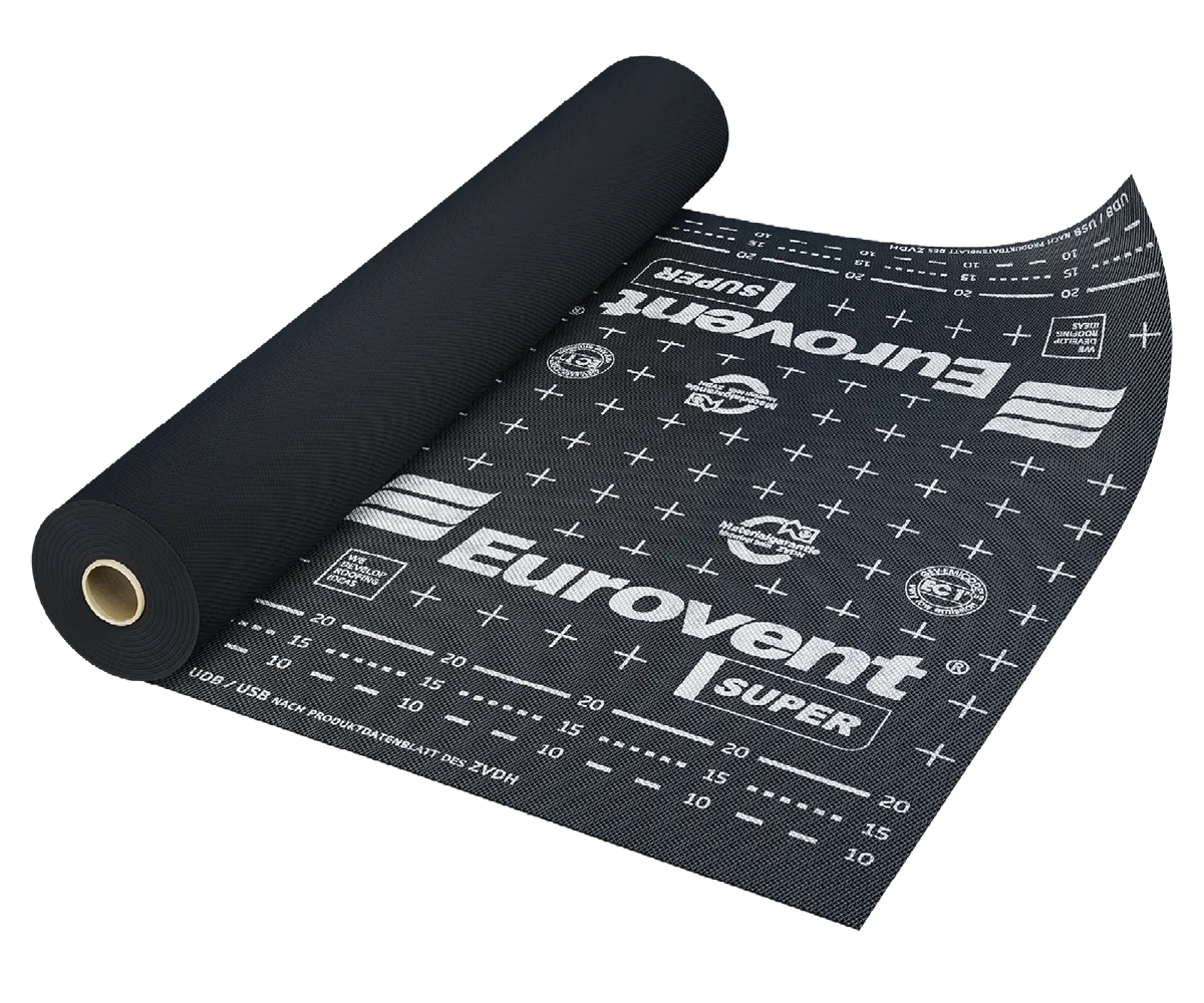 Membrana dachowa Eurovent® SUPER, trójwarstwowa, wysokoparoprzepuszczalna membrana dachowa stosowana do dachów skośnych ocieplonych i wentylowanych, także z pełnym deskowaniem. Posiada najwyższą w swojej klasie odporność na rozrywanie, w związku z czym jest wybierana przez najbardziej wymagających dekarzy. Nadaje się pod dachówki betonowe, dachówki ceramiczne, blachodachówki, blachy aluminiowe oraz łupek naturalny. Doskonale sprawdzi się w budownictwie tradycyjnym, szkieletowym, również pasywnym czy modułowym.