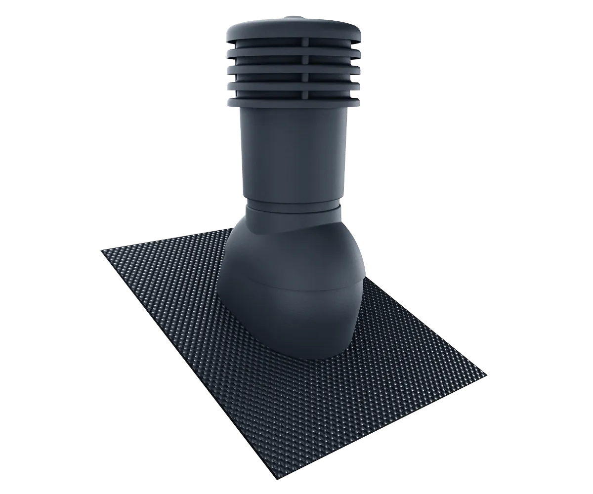 Zaawansowany kominek dachowy Eurovent® VENTOS X BITU UNI ALU o przekroju wentylacyjnym 170 mm oraz średnicy przyłącza 150 mm. Wykonany z wysokiej jakości tworzywa sztucznego, uszczelki EPDM oraz elastycznego aluminiowego kołnierza izolacyjnego FLEX 3D z grubą warstwą butylu o wymiarach 400 mm 550 mm. Budowa kominka wspomaga wentylację wykorzystując do tego energię wiatru, zapewnia prawidłowy ciąg kominowy. Posiada system antykondensacyjny, który odprowadza skropliny na zewnątrz dachu. Profilowana nasada zapobiega napływaniu wody opadowej do wnętrza. Regulacja kąta nachylenia od 5° do 45°. Posiada uniwersalną, elastyczną podstawę do montażu kominka m.in. na blachach trapezowych. Dostępny w kilku najpopularniejszych wersjach kolorystycznych wg kolorystyki RAL.