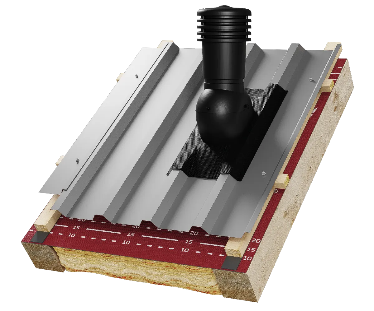 - akcesoriami montażowymi systemu Eurovent®, takimi jak FLEX X, FLEXOS X oraz SEAL EPDM, które zapewniają trwałe i szczelne połączenie kominka wentylacyjnego z pokryciem dachowym;