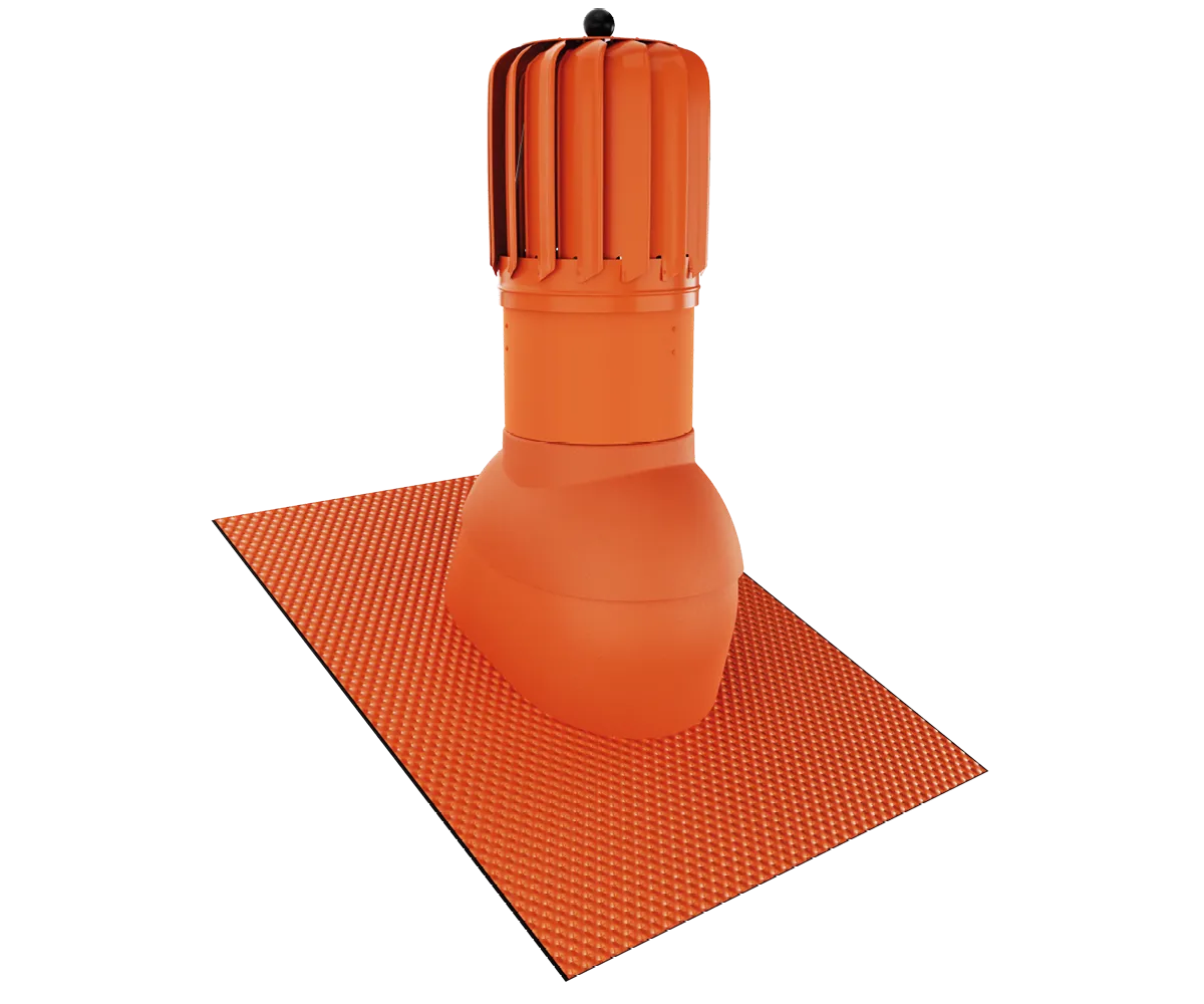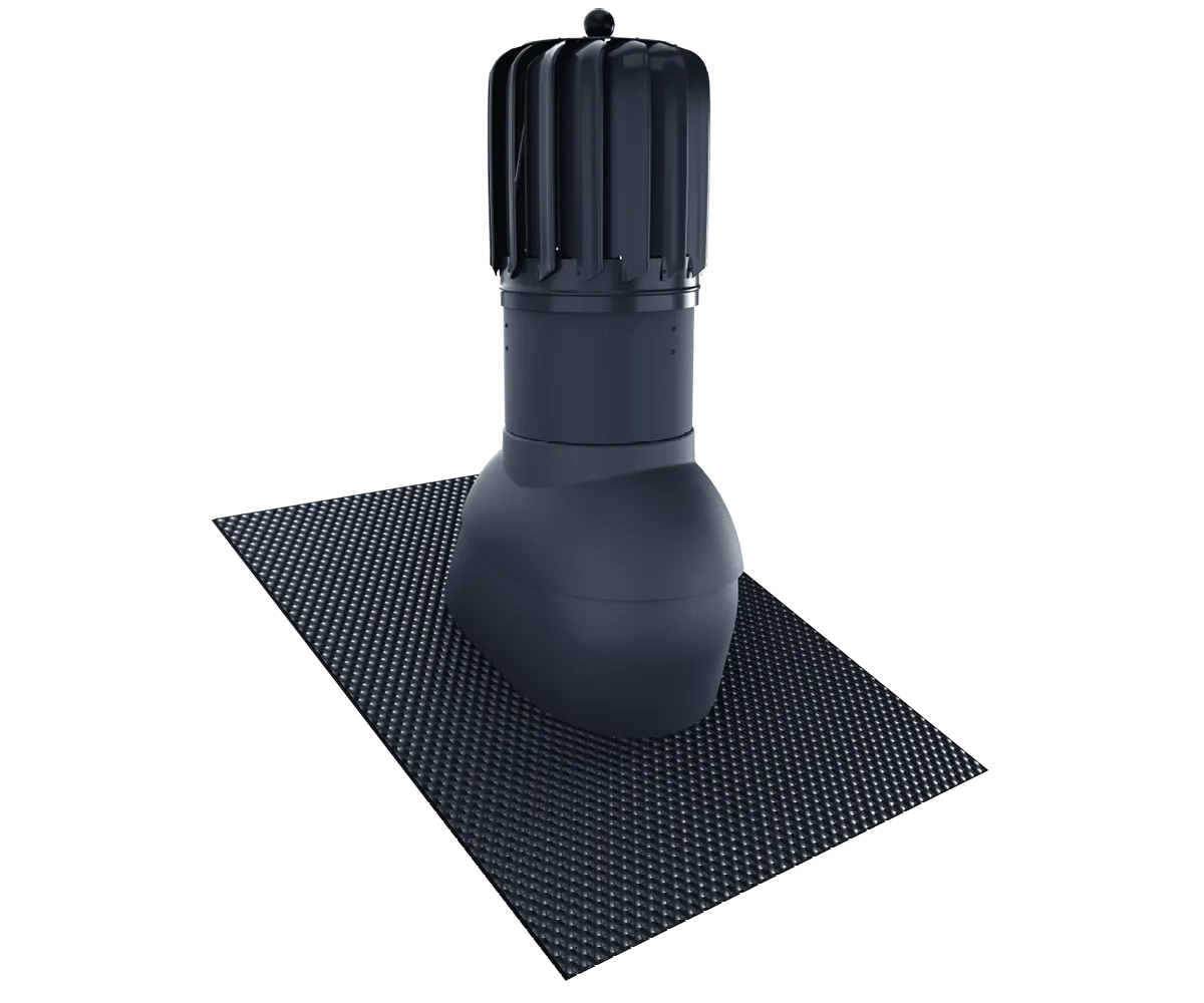 Kominek dachowy rotacyjny Eurovent® VENTOS X ROTO BITU ALU o przekroju wentylacyjnym 170 mm oraz o średnicy przyłącza 150 mm. Wykonany z wysokiej jakości tworzywa sztucznego, aluminium oraz blachy ocynkowanej oraz podstawy z wysokiej jakości tworzywa sztucznego, uszczelki EPDM oraz elastycznego kołnierza izolacyjnego FLEX 3d z aluminium i grubą warstwą butylu o wymiarach 400 mm 550 mm. Wyposażony został w turbinę osadzoną na specjalnym łożysku kulkowym zapewniający niską oporność oraz wysoką sprawność. Zastosowana turbina wyposażona aż w 15 profilowanych aluminiowych łopatek o geometrii zwiększającej prawidłowy ciąg kominowy przez wytworzenie ciśnienia w kanale wentylacyjnym, zapobiega tym samym powstawaniu efektowi ciągu wstecznego. Posiada regulację kąta nachylenia od 5° do 45°. Posiada uniwersalną podstawę do montażu kominka m.in. na blachach trapezowych. Kominek występuje w kilku najpopularniejszych wersjach kolorystycznych wg. kolorystyki RAL.
